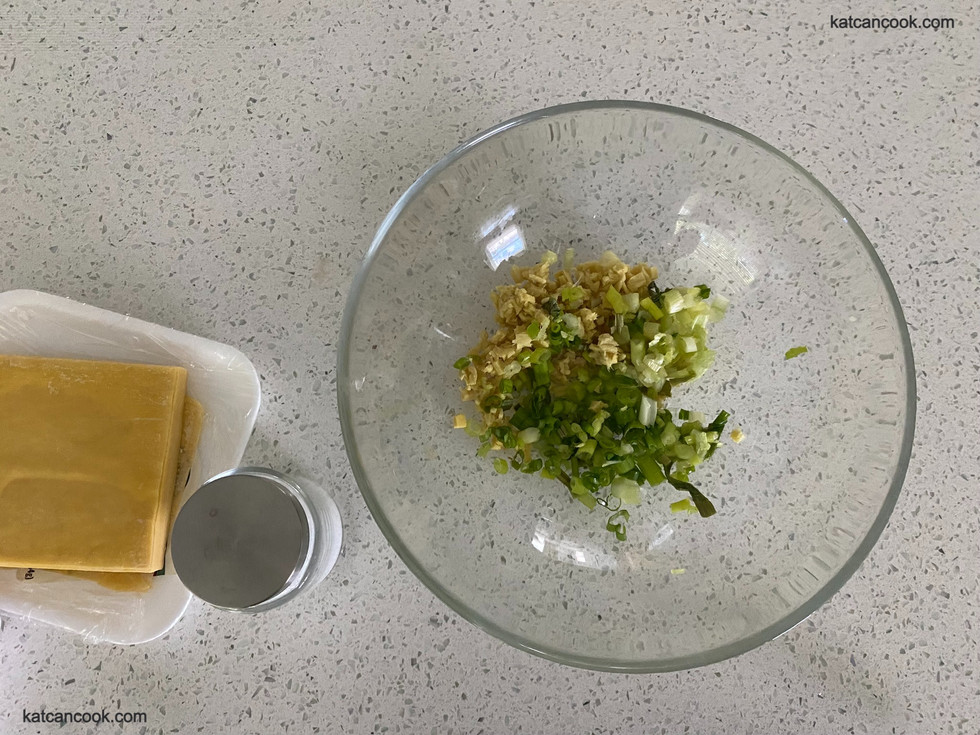 Start by prepping ingredients: mince green onion and ginger. Alternatively, you can grate the ginger.